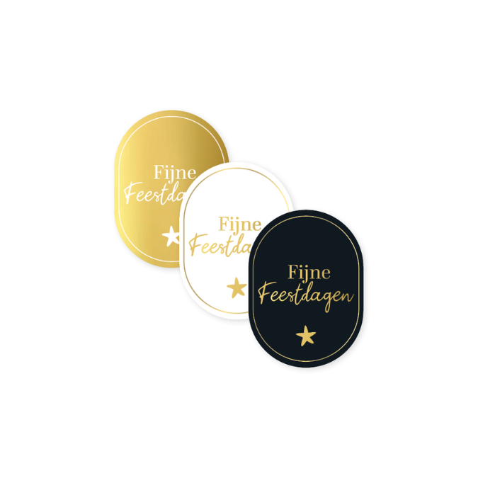 Maak je cadeaus helemaal af met deze luxe feestdagstickers! Deze stijlvolle stickerset bevat drie verschillende ontwerpen in de kleuren goud, zwart en wit, met de tekst “Fijne Feestdagen”. De ovale stickers, met een afmeting van 43x59mm, zijn perfect om cadeautjes en verpakkingen een elegante en feestelijke uitstraling te geven.