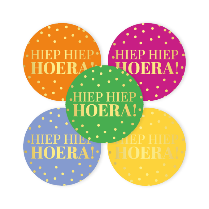 Stickerset Hiep Hiep Hoera 5cm – gekleurd confetti design